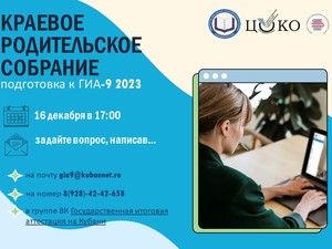 Краевое родительское собрание по вопросам подготовки к ГИА-9 и итоговому собеседованию по русскому языку ср, 14.12.2022 - 12:08 ГИА Подробнее о Краевое родительское собрание по вопросам подготовки к ГИА-9 и итоговому собеседованию по русскому языку