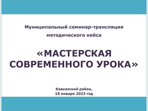 Муниципальный семинар – трансляция методического кейса «Мастерская современного урока» пт, 20.01.2023 - 17:01 Мероприятия Подробнее о Муниципальный семинар – трансляция методического кейса «Мастерская современного урока»