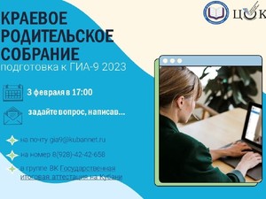 3 февраля 2023 г. пройдет краевое родительское собрание по вопросам подготовки к ГИА-9 пт, 27.01.2023 - 14:25 ГИА Подробнее о 3 февраля 2023 г. пройдет краевое родительское собрание по вопросам подготовки к ГИА-9
