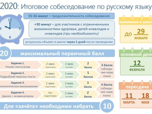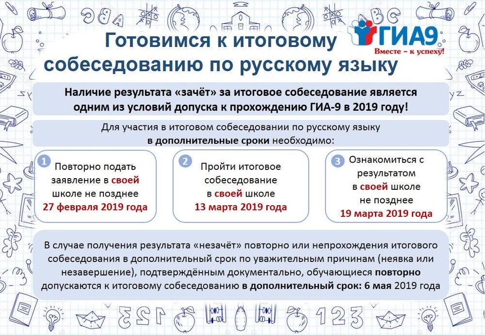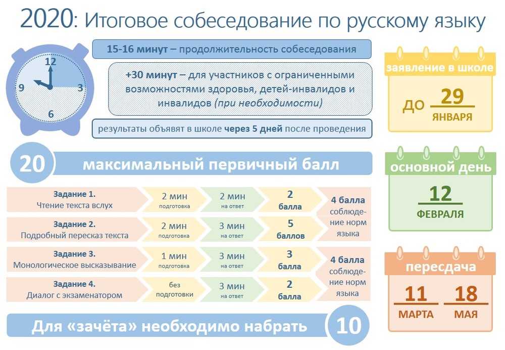 Итоговое собеседование проводится во вторую среду февраля. Дополнительные сроки проведения итогового собеседования — вторая рабочая среда марта и третий понедельник апреля.