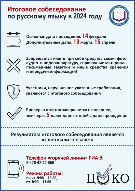 Основная дата проведения итогового собеседования – 14 февраля 2024 года. В дополнительные даты проведения итогового собеседования в текущем учебном году – 13 марта и 15 апреля 2024 года допускаются участники итогового собеседования: - получившие неудовлетворительный результат («незачет»); - не явившиеся и (или) не завершившие итоговое собеседование по уважительным причинам, подтвержденным документально; - удаленные с итогового собеседования за нарушение требований Порядка.