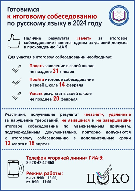 В соответствии с Порядком проведения государственной итоговой аттестации по образовательным программам основного общего образования, утвержденным приказом Министерства просвещения Российской Федерации и Федеральной службы по надзору в сфере образования и науки от 4 апреля 2023 г. № 232/551 (далее - Порядок), успешное прохождение итогового собеседования по русскому языку (далее – итоговое собеседование) является для выпускников 9-х классов одним из условий допуска к государственной итоговой аттестации (далее - ГИА).