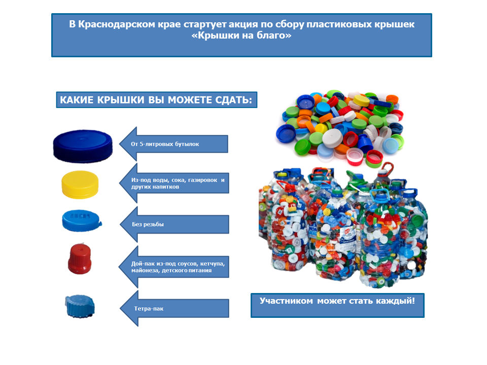 Участником может стать каждый. Для этого необходимо собрать как можно больше чистых пластиковых крышек в местах сбора.