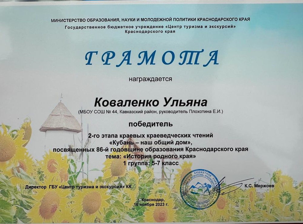 16 ноября 2023 года в г. Краснодаре в ГБУ ДО «Центр туризма и экскурсий» Краснодарского края состоялось награждение победителей и призеров краевых краеведческих чтений «Кубань – наш общий дом», посвященных 86-годовщине образования Краснодарского края.